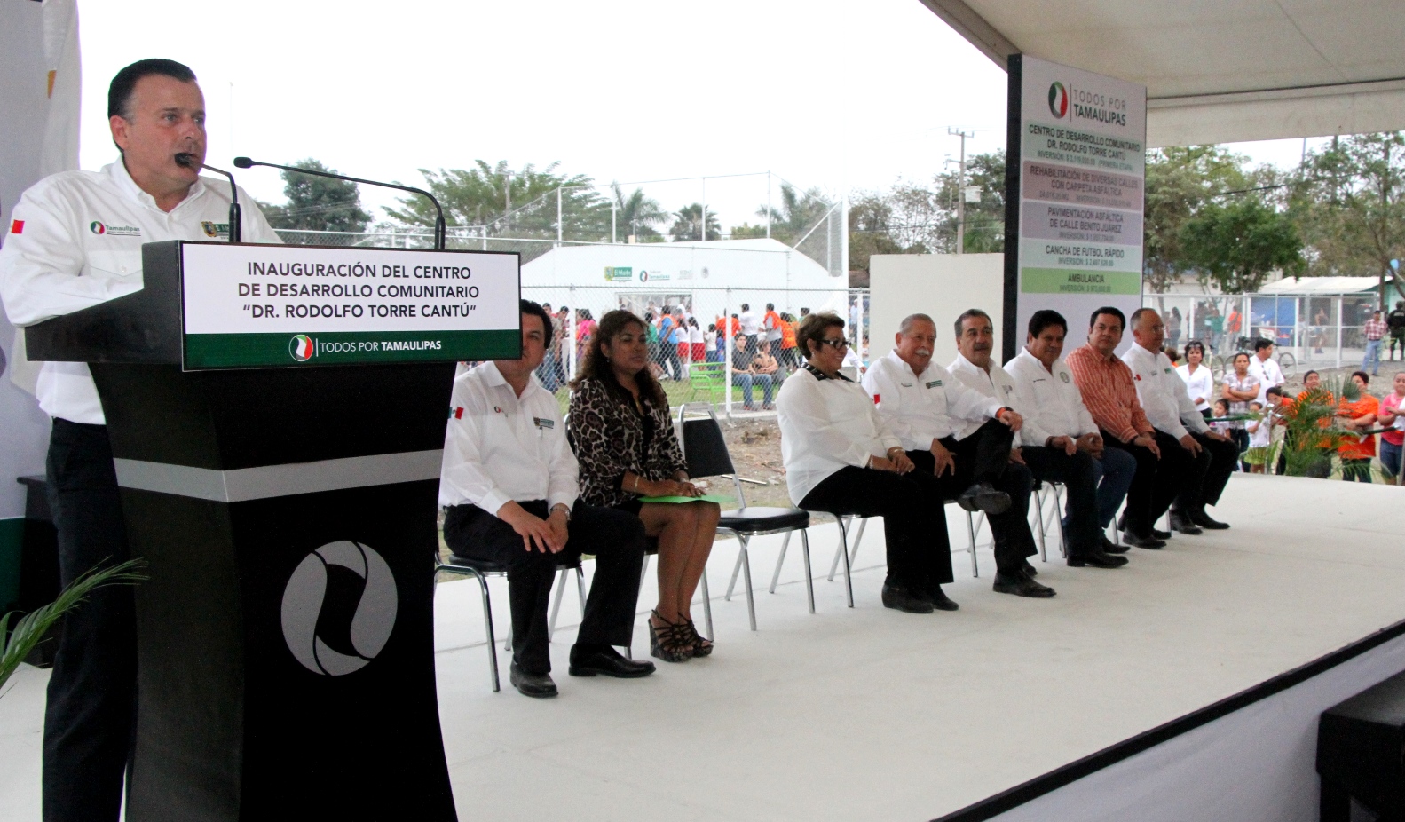 Posteriormente, en la colonia Progreso Social, frente a cientos de familias de esta zona de la Ciudad, el líder de los tamaulipecos junto al presidente municipal de El Mante entregó un importante paquete de obras de bienestar social. En este sector de la población, se inauguró el Centro de Desarrollo Comunitario “Doctor Rodolfo Torre Cantú”, con un monto que alcanza los 3 millones 119 mil pesos en su primera etapa y beneficia a 11 colonias del sector poniente; la cancha de fútbol rápido, con una inversión cercana a los 2 millones 500 mil pesos; la pavimentación de calle Benito Juárez, con un costo superior a un millón de pesos; la entrega de una ambulancia al Hospital “Doctor Emilio Martínez Manautou”, con un valor cercano al millón de pesos, así como el anuncio de más de 13 millones 500 mil pesos en obras de rehabilitación con carpeta asfáltica en una superficie de 24 mil 616 metros cuadrados.